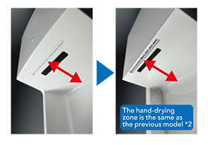 While the unit itself is compact, the new model has a spacious hand-drying zone that is 128mm deep. The nozzle and sensor are located toward the front (*3) for quick drying without touching the unit.