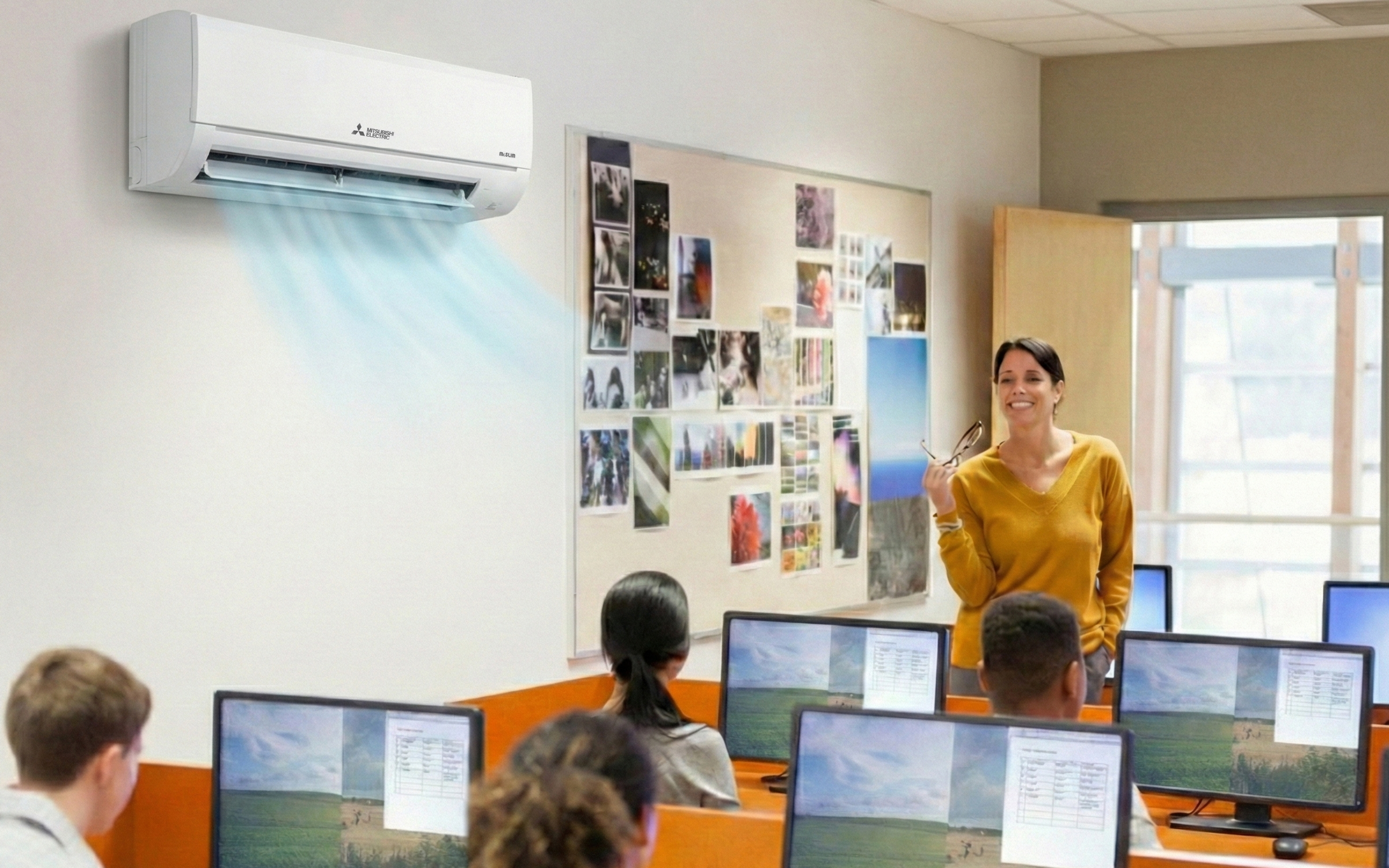 Along these lines, we offer the Mr. SLIM Inverter Series for use in classrooms, clinics, and offices. Its inverter technology varies compressor speed to match the actual heat load, instead of repeatedly turning completely on and off. This prevents sudden temperature swings that can distract students and make rooms feel “too cold” or “too warm” during class. It also keeps operations steady and quiet, and educators need not worry about competing with equipment noise for their students’ attention. Many Mitsubishi Electric air conditioners are also powered by the ozone-friendly R-32 refrigerant, favored for its low global warming potential.t